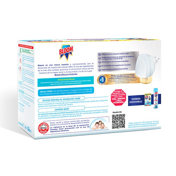 Bloom elétrico líquido Zero oferece até 90 noites de proteção contra os mosquitos comum e tigre com 0% fragrância e 0% conservantes. Além disso, pode ser usado na presença de bebês de +6 meses (até 12 horas por dia) e permite minimizar os incômodos associados aos inseticidas tradicionais, com o objetivo de evitar possíveis reações alérgicas em pessoas sensíveis.