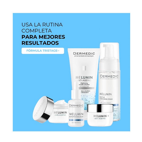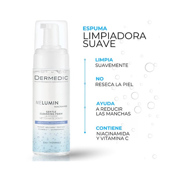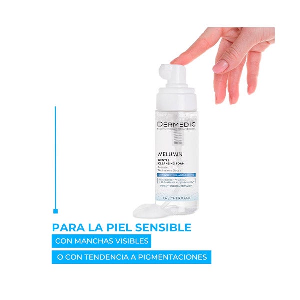 MELUMIN Espuma de limpeza suave é um produto de limpeza delicado, recomendado para peles sensíveis com tendência à hiperpigmentação. O complexo Melumin Tristage™, composto por uma combinação de Vitamina C (potente antioxidante) encapsulada em lipossomas, Lightderm Gly® e Niacinamida, impede a formação de hiperpigmentação reduzindo a atividade da tirosinase, o número de melanosomas e o transporte de melanina para as células epidérmicas. As propriedades suavizantes da água termal e D-Pantenol contribuem para a regeneração da epiderme, hidratando-a e ajudando a reconstruir sua estrutura biológica original. Contém vitamina A.