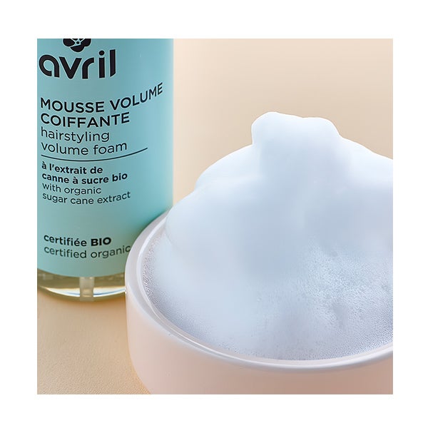 Enriquecida com proteínas orgânicas de tremoço e extrato orgânico de cana-de-açúcar, a mousse volumizadora orgânica certificada da Avril facilita o penteado do cabelo enquanto proporciona volume e brilho.