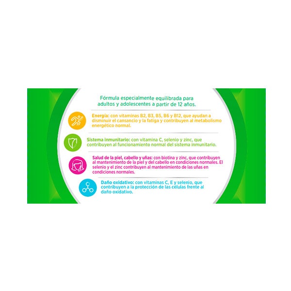 Suplemento alimentar com vitaminas e minerais que ajuda a cobrir os requisitos nutricionais de adultos e adolescentes a partir de 12 anos.