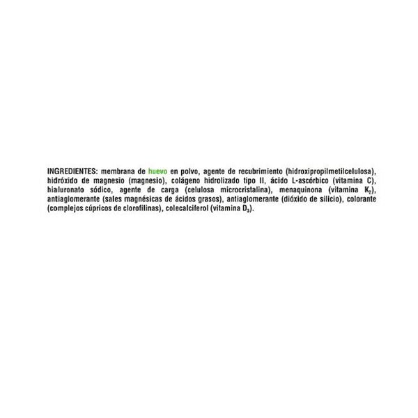 Membrana de huevo en polvo, agente de recubrimiento (hidroxipropilmetilcelulosa), hidróxido de magnesio (magnesio), colágeno nativo tipo II, ácido L-ascórbico (vitamina C), hialuronato sódico, agente de carga (celulosa microcristalina), menaquinona (vitamina K2), antiaglomerante (sales magnésicas de ácidos grasos), antiaglomerante (dióxido de silicio), colorante (complejos cúpricos de clorofilinas), colecalciferol (vitamina D3).