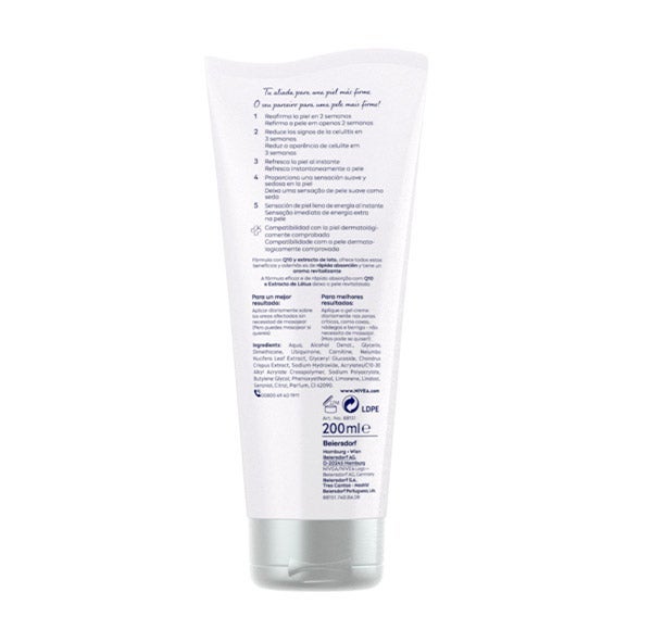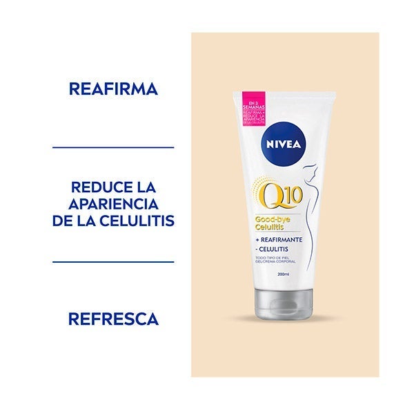 NIVEA Q10 MULTI POWER 5in1 Gel-Creme Anticelulítico + Reafirmante reafirma a pele em 2 semanas melhorando sua elasticidade e firmeza e reduz os sinais de celulite em 3 semanas. A fórmula deste gel anticelulítico, enriquecida com Coenzima Q10 e Extrato de Lótus, estimula a regeneração celular e a transformação da gordura celular em energia. Além disso, a textura em Gel-Creme desta creme anticelulítico da NIVEA penetra rapidamente refrescando a pele instantaneamente e proporcionando uma sensação suave, sedosa e cheia de energia. Consiga uma pele visivelmente mais lisa e reduza os sinais de celulite em sua pele com este gel-creme anticelulítico. Compatibilidade com a pele dermatologicamente comprovada.