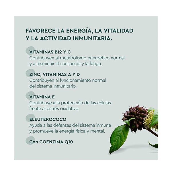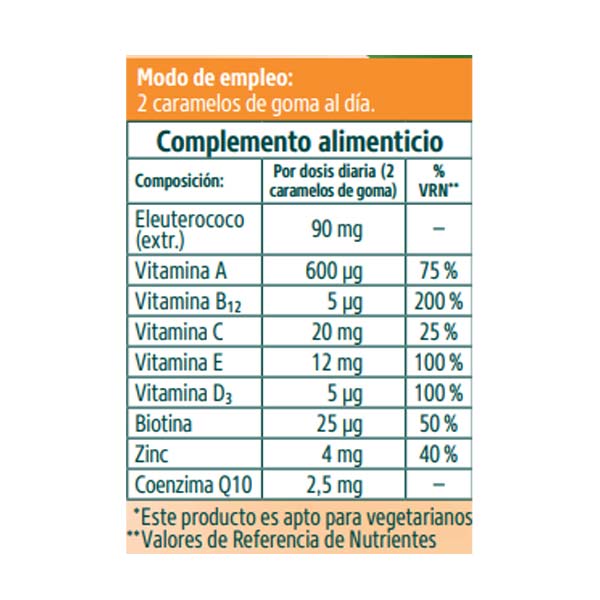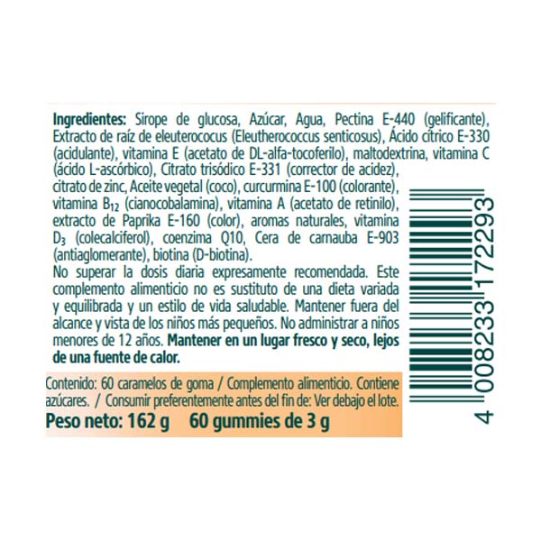 Ingredientes: Sirope de glucosa, Azúcar, Agua, Pectina E-440 (gelificante), Extracto de raíz de eleuterococus (Eleutherococcus senticosus), Ácido cítrico E-330 (acidulante), vitamina E (acetato de DL-alfa-tocoferilo), maltodextrina, vitamina C (ácido L-ascórbico), Citrato trisódico E-331 (corrector de acidez), citrato de zinc, Aceite vegetal (coco), curcurmina E-100 (colorante), vitamina B12 (cianocobalamina), vitamina A (acetato de retinilo), extracto de Paprika E-160 (color), Aroma natural de limón, Aroma natural de naranja, vitamina D3 (colecalciferol), coenzima Q10, Cera de carnauba E-903 (antiaglomerante), biotina (D-biotina).