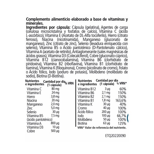 Ingredientes por cápsula: Cápsula (gelatina), Agentes de carga (celulosa microcristalina y fosfatos de calcio), Vitamina C (Ácido L-Ascórbico), Vitamina E (Acetato de DL-Alfa tocoferilo), Hierro(citrato ferroso), Niacina (nicotinamida), Manganeso(gluconato de manganeso), Zinc (citrato de zinc), Selenio (levadura enriquecida con selenio), Vitamina B5 o Ácido pantoténico (D-Pantotenato cálcico), Vitamina A(acetato de retinilo), Antiaglomerante(sales magnésicas de Ácidos grasos), Vitamina D3 (Colecalciferol),Cobre (gluconato cúprico), Vitamina B12 (Cianocobalamina), Vitamina B6(clrohidrato de piridoxina), Vitamina B2(Riboflavina), Vitamina B1(clrohidrato de tiamina), Vitamina K (Filoquinona), Cromo(picolinato de cromo), Folato o Ácido fólico, Iodo(yoduo de potasio), Molibdeno (molibdato de sodio), Biotina (D-biotina).