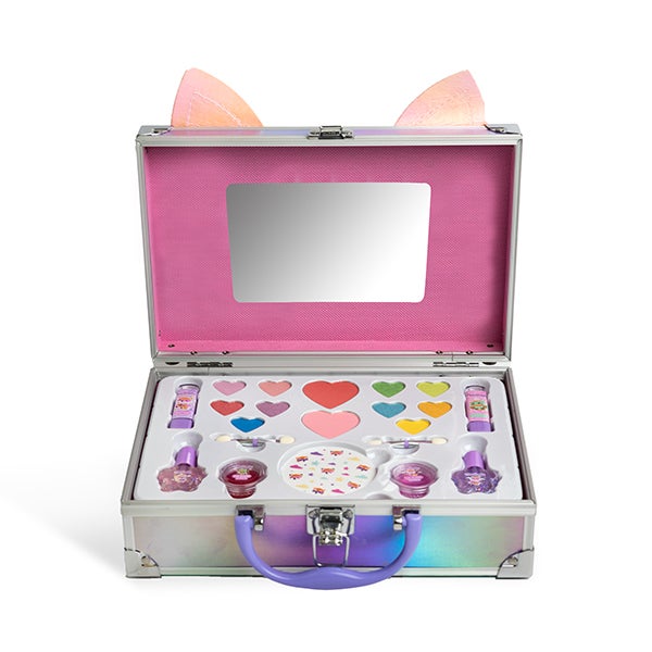 Contém dez sombras de olhos, dois batons, dois esmaltes de unhas com purpurina, dois brilhos labiais, dois blushes, dois aplicadores e adesivos.