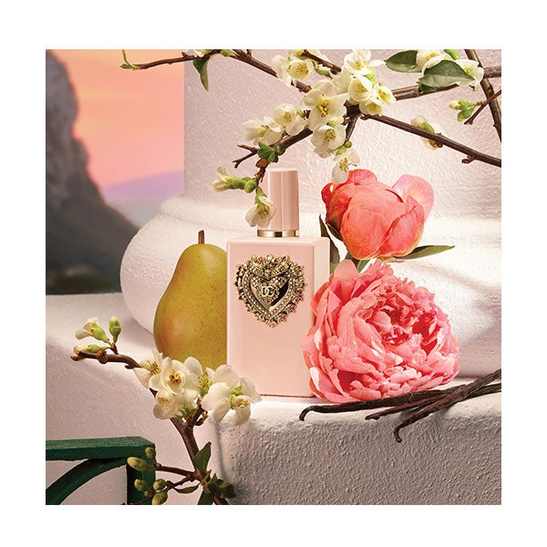 O perfume é apresentado em um frasco rosa brilhante adornado com o Sacro Cuore dourado, um design requintado que reflete a elegância atemporal e a artesania refinada de Dolce & Gabbana.