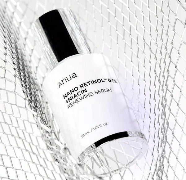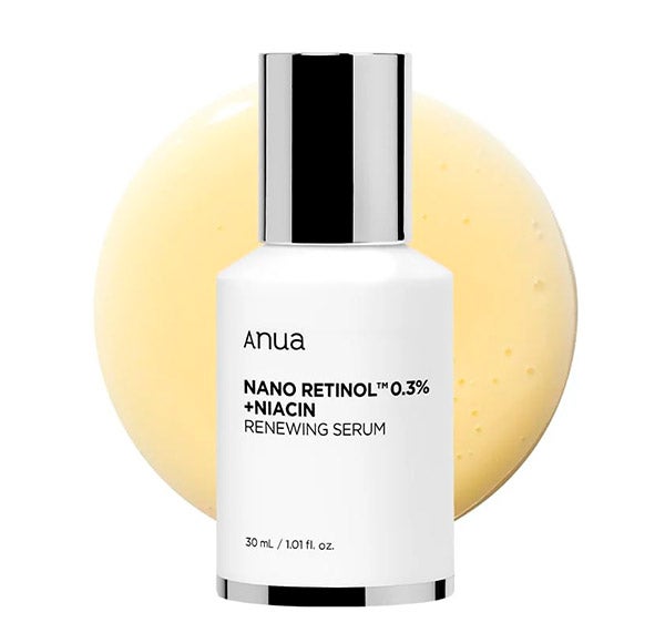 O sérum Anua Nano Retinol 0,3% + Niacin Renewing é uma solução potente iluminadora que combina Retinol e Niacinamida para atenuar rugas e manchas de hiperpigmentação, enquanto restaura a firmeza da pele. É combinado com peptídeos adicionados para maior hidratação e redução de rugas, junto com ingredientes como óleo de folha de árvore do chá e ceramida para efeitos calmantes e hidratantes, também minimiza os poros e firma a pele flácida para uma tez rejuvenescida
