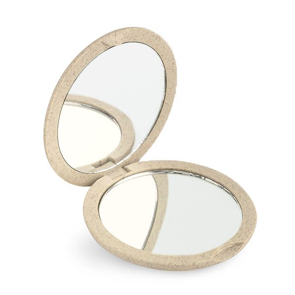 Espelho Duplo Dobrável Elaborado com um material natural à base de fibra de trigo, 100% biodegradável. Embalagem em cartão certificado FSC. Reciclável, reutilizável e sustentável.