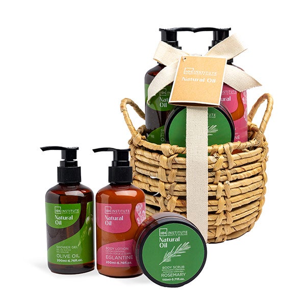 Neste caso, esta cesta inclui um gel de banho, um creme corporal e um esfoliante corporal para um cuidado corporal completo.