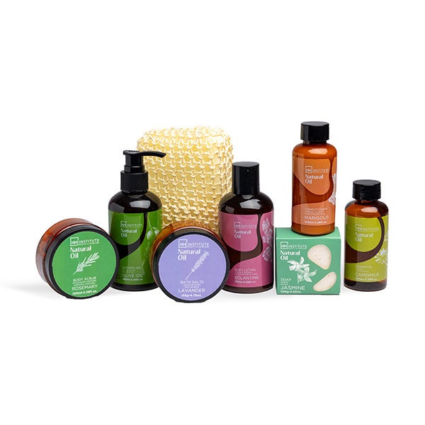 Esta cesta reutilizável com produtos naturais de Natural Oil é o presente perfeito para aqueles que gostam de se cuidar, pois inclui um gel de banho, sais de banho, uma loção corporal, um sabonete sólido, shampoo, condicionador, creme para as mãos, esfoliante corporal e uma esponja de sisal.