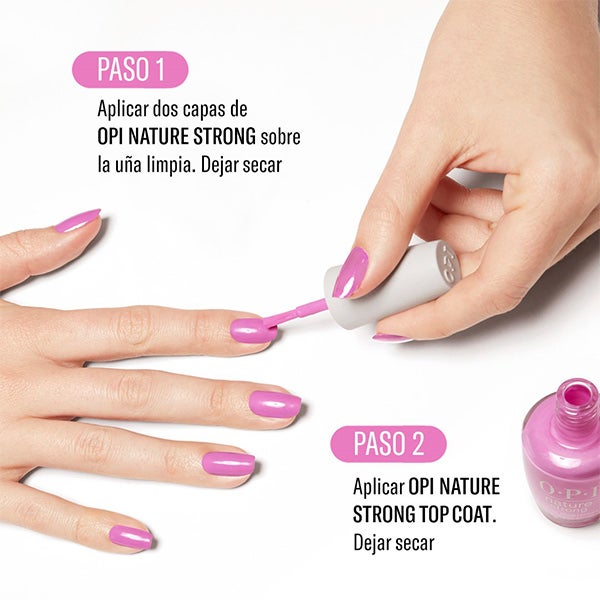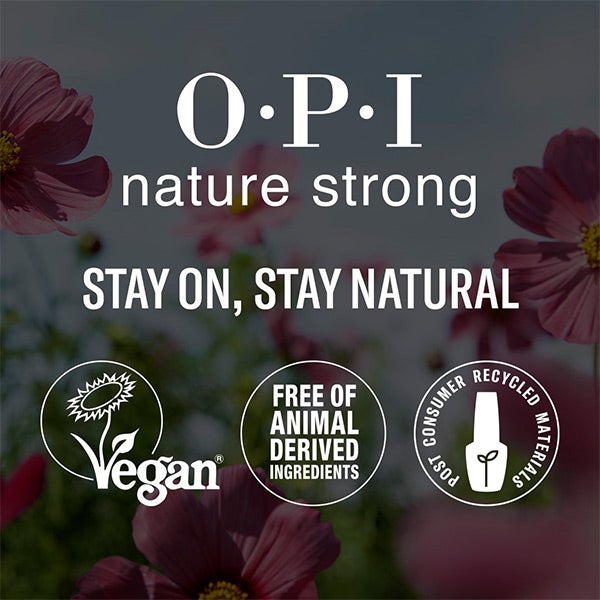 A fórmula do esmalte de unhas vegano, não tóxico, não é testada em animais, seca rapidamente e é apresentada em uma embalagem sustentável. O esmalte de unhas Nature Strong da OPI não contém ingredientes de origem animal e é elaborado com até 75,6% de ingredientes de origem natural.