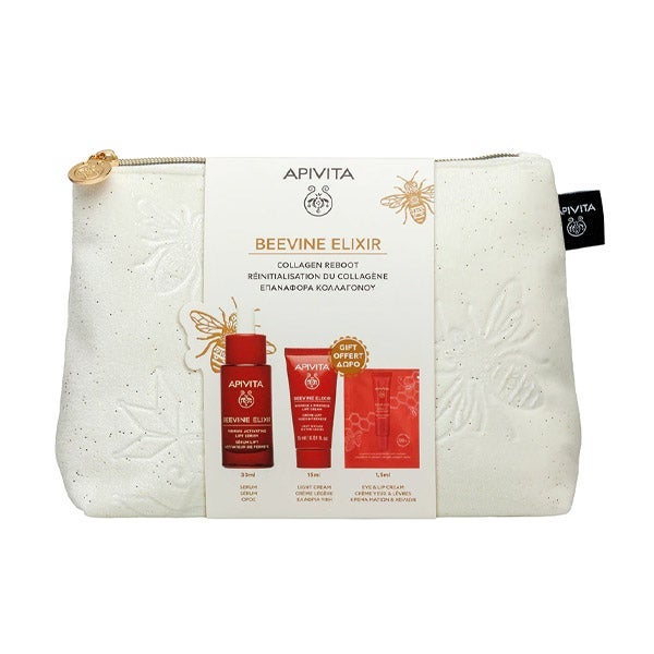 O Estojo Beevine Elixir Sérum Lift Ativador de Firmeza da Apivita inclui três produtos essenciais para uma rotina diária focada no cuidado da pele. Contém o BEEVINE ELIXIR Sérum Lift Ativador de Firmeza, que hidrata, nutre e preenche as rugas, proporciona luminosidade com um efeito tensor imediato. Inclui também o BEEVINE ELIXIR Creme Lift Rugas e Firmeza, que reafirma a pele, melhora sua elasticidade e proporciona hidratação. Por último, o BEEVINE ELIXIR Contorno de Olhos e Lábios Lift alisa e reafirma a pele nessas áreas, oferecendo um aspecto mais luminoso. Este estojo é projetado para o cuidado feminino e se concentra em combater as rugas.