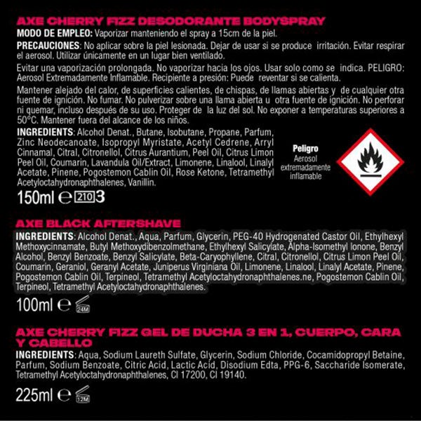 AXE Cherry Fizz Gel de Ducha 3 en 1 Cuerpo, Cara y Cabello (225 ml): Aqua, Sodium Laurath Sulfate, Glycerin, Sodium Chloride, Cocamidopropyl Betaine, Parfum, Sodium Benzoate, Citric Acid, Lactic Acid, Disodium EDTA, PPG-6, Saccharide Isomerate, Tetramethyl Acetyloctahydronaphthalenes, CI 17200, CI 19140.