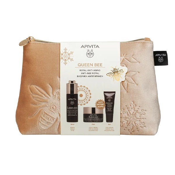 O Estojo Queen Bee da Apivita é um conjunto exclusivo para o cuidado facial. Inclui o QUEEN BEE Sérum Redensificante Antienvelhecimento Absoluto, que contém Geleia Real de liberação controlada, formulado para reduzir rugas, aumentar a firmeza da pele, redefinir o contorno facial e restaurar o volume e a densidade da pele, proporcionando um efeito tensor imediato e uma hidratação profunda. Também inclui o QUEEN BEE Creme Antienvelhecimento Absoluto, que tem uma textura leve e compartilha propriedades semelhantes ao sérum, focando na redução de rugas e na melhoria da renovação celular. O estojo contém o QUEEN BEE Contorno de Olhos Revitalizante Antienvelhecimento Absoluto, que ajuda a diminuir as linhas de expressão e as rugas profundas, eleva as pálpebras e reduz bolsas e olheiras, enquanto hidrata e revitaliza a delicada área do contorno dos olhos.