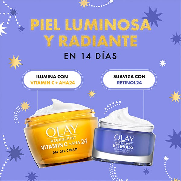 Pela manhã, use o creme de dia Olay Regenerist Vitamin C + AHA 24 que proporciona uma pele mais luminosa em apenas 1 dia e um tom e textura visivelmente mais uniformes.