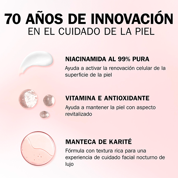 Linhas de expressão e rugas? Nunca é cedo demais para começar a preveni-las ou atenuá-las. Experimente o creme hidratante noturno de Niacinamida 24 + Vitamina E da Olay: projetado para penetrar até 10 camadas de profundidade, combina a força da Niacinamida pura a 99% com a proteção antioxidante comprovada da Vitamina E. A Manteiga de Karité proporciona uma textura rica e hidratante para uma experiência de cuidado noturno de luxo. Este creme noturno garante hidratação o dia todo e resultados visíveis: após 1 noite, a pele está mais suave e revitalizada e, após 14 noites, a firmeza e a elasticidade melhoram visivelmente. Experimente o poder hidratante da Niacinamida 24 + Vitamina E da Olay.