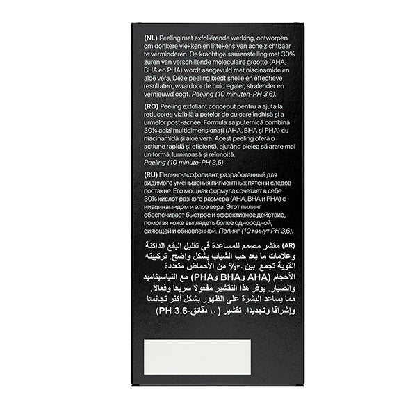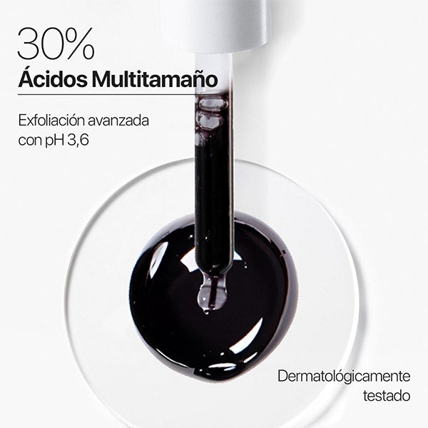 Sua fórmula potente combina 30% de ácidos de múltiplos tamanhos (AHA, BHA e PHA) com Niacinamida e Aloe Vera.