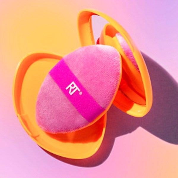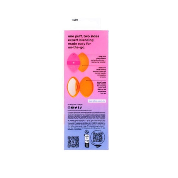 O lado ROSA inclui NOVAS fibras de pelúcia que recolhem e aplicam a quantidade certa de pó para fixar ou refrescar a base. O lado LARANJA é feito do nosso material Miracle Complexion Sponge mais vendido para misturar sem esforço fórmulas líquidas ou em creme.