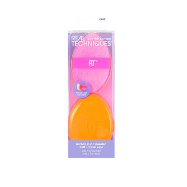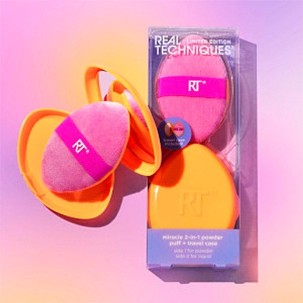 A borla para pós Miracle 2 em 1 + estojo de viagem da Real Techniques inclui nossa borla de maquiagem multiuso de dupla textura e um estojo de viagem para retoques em movimento.