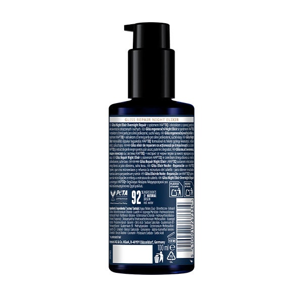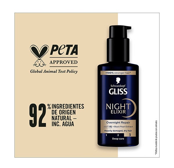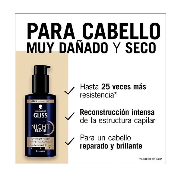 Desenvolvido para cabelos muito danificados e secos, Night Elixir Reparação contém Extrato de Pérola Negra + HaptIQ System, que cria micro-ligações e fortalece a estrutura do cabelo, proporcionando até 25 vezes mais resistência* e brilho (*vs. cabelos não tratados).