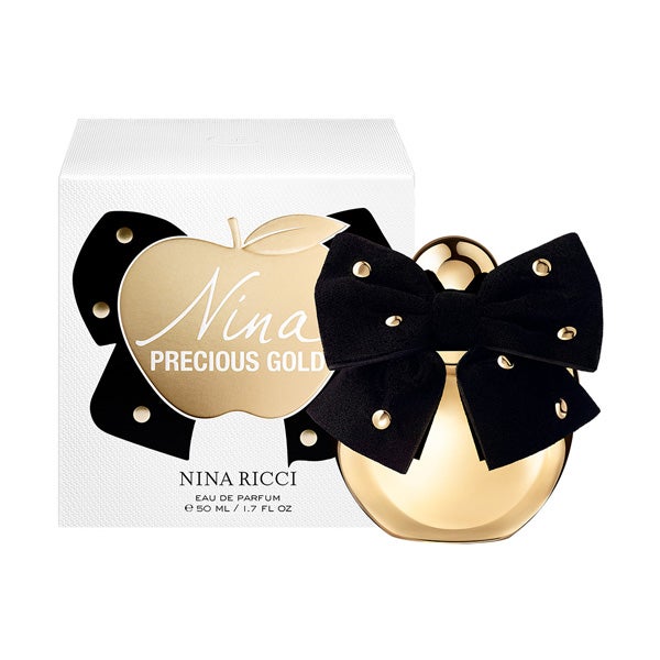 Descubra Nina Precious Gold Eau de Parfum de Nina Ricci, uma fragrância luxuosa e elegante, projetada para mulheres que buscam um aroma único e sofisticado. Inspirada no brilho do ouro, esta joia olfativa é apresentada no icônico frasco em forma de maçã, que nesta edição está coberto com um precioso acabamento dourado. Adornado com um laço de veludo preto e bolinhas douradas, o design do frasco reflete a feminilidade feroz e o glamour das últimas criações de moda de Harris Reed.