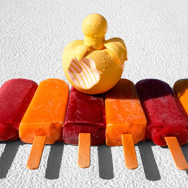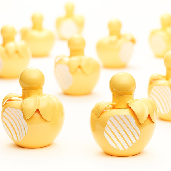 Para Nina Soleil, o icônico frasco em forma de maçã se veste de um tom amarelo ensolarado e otimista, como se tivesse absorvido os raios de sol do verão.