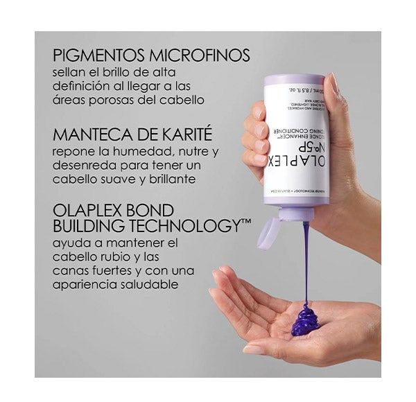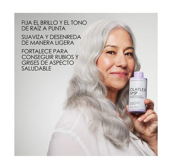 O condicionador nutritivo nº5P da marca Olaplex que neutraliza os tons amarelos indesejados da raiz às pontas, fixa o brilho, suaviza, desembaraça e fortalece o cabelo. Com os usos, os cabelos loiros e grisalhos tornam-se mais brilhantes e uniformes com uma aparência saudável.