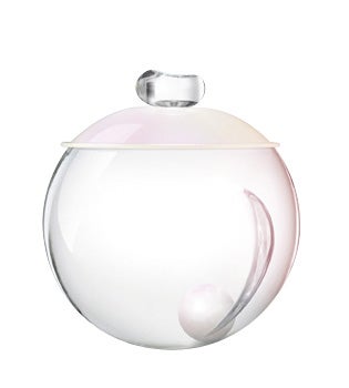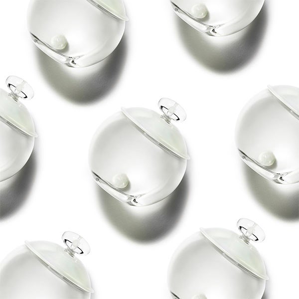 O frasco esférico como um planeta, encerra uma pérola em seu interior, símbolo da feminilidade e o misterioso da vida.