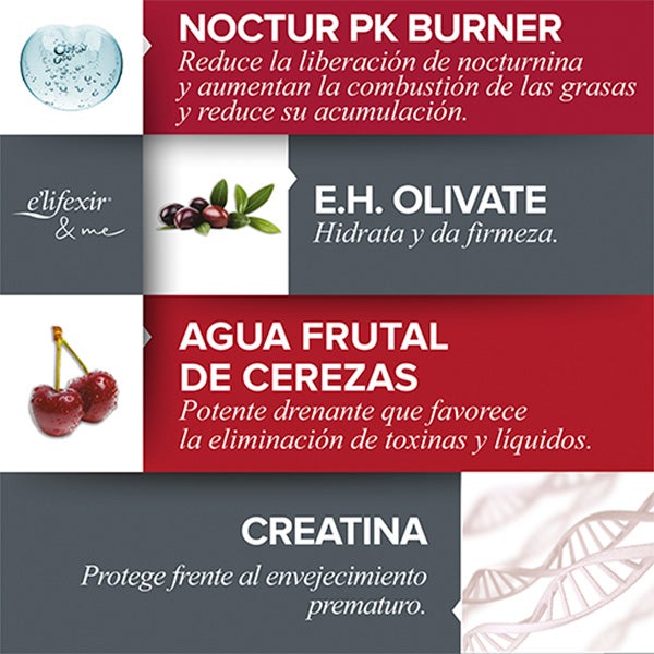 Graças ao seu ativo Noctur PK Burner reduzirás a liberação da proteína nocturnina, encarregada de aumentar o acúmulo de gorduras no nosso corpo, favorecendo sua combustão. Ou seja, reduzirás a gordura durante a noite enquanto descansas. Além disso, sua fórmula com água frutal te ajudará a eliminar líquidos e toxinas, proporcionando uma sensação de relaxamento e descanso prazeroso durante toda a noite.