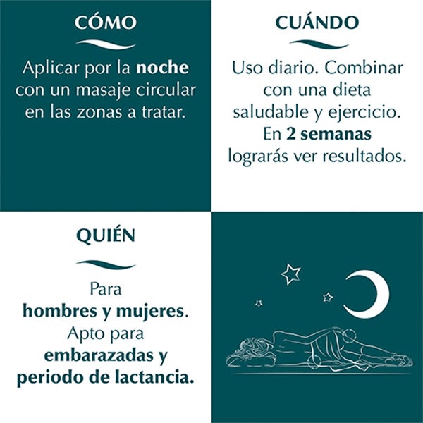 Creme redutor noturno com efeito tríplice ação intensiva: queima gordura, drenante e anticelulítico. Elimina a gordura localizada e combate sua acumulação; ação drenante, que favorece a eliminação de líquidos e toxinas; e uma sensação prazerosa de relaxamento no corpo para o descanso noturno graças à sua textura fresca e leve.