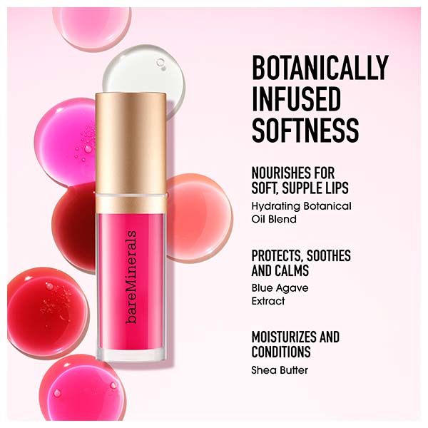 O primeiro óleo labial ultra-hidratante e não pegajoso da bareMinerals é composto por uma mistura única de 9 óleos botânicos e ácido hialurônico que acalmam e condicionam para conseguir lábios macios, suaves e com um aspecto saudável.