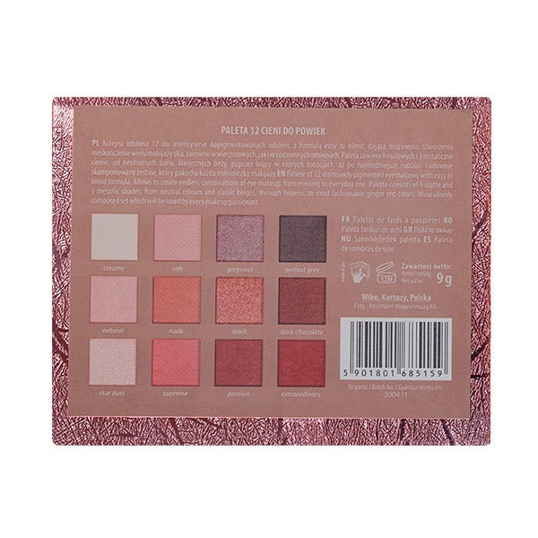 Uma paleta de 12 sombras intensamente pigmentadas com uma fórmula fácil de misturar para infinitas possibilidades de maquiagem de olhos, seja para noites de festa ou para ambientes informais. A paleta contém 9 sombras mates e 3 sombras metálicas, desde tons neutros, beiges clássicos, passando por tons marrons até os últimos sucessos: os avermelhados. Uma combinação incrível para que todas as amantes de maquiagem desfrutem. Deixe-se levar por uma multitude de possibilidades.