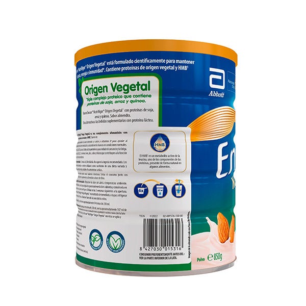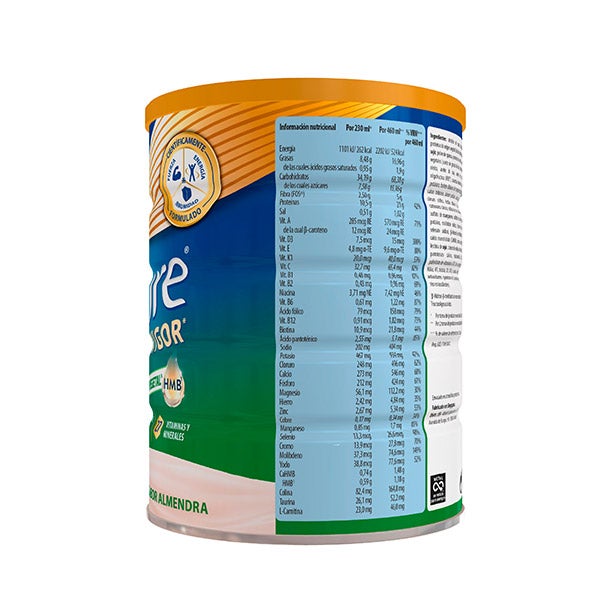 Almidón de maíz hidrolizado, proteínas de origen vegetal (aislado de proteína de SOJA, polvo de quinoa, proteína de arroz), aceites vegetales (aceite de girasol de alto contenido en oleico, aceite de soja, aceite de canola), oligofructosa (FOS), sacarosa, minerales (citrato potásico, fosfato dibásico de magnesio, fosfato de calcio tribásico, cloruro potásico, citrato sódico, cloruro sódico, fosfato dibásico de potasio, carbonato cálcico, sulfato de zinc, sulfato ferroso, sulfato de manganeso, sulfato de cobre, yoduro potásico, molibdato sódico, cloruro de cromo, selenato sódico), β-Hidroxi-β-metilbutirato de calcio monohidrato (CaHMB), aroma, emulgente: lecitina de SOJA, cloruro de colina, vitaminas (C, E, pantotenato cálcico, niacinamida, B6, B2, palmitato de vitamina A, B1, beta-caroteno, ácido fólico, K1, biotina, D3, B12), taurina, L-carnitina, antioxidantes (palmitato de L-ascorbilo, extracto rico en tocoferoles).