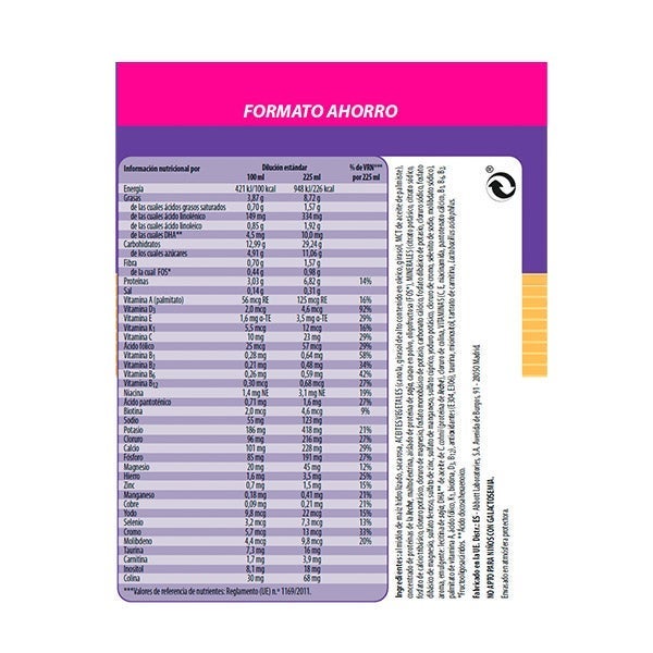 Almidón de maíz hidrolizado, sacarosa, ACEITES VEGETALES (canola, girasol de alto contenido en oleico, girasol MCT de aceite de palmiste), concentrado en proteínas de la leche, maltodextrina, aislado de proteína de soja, cacao en polvo, oligofructosa (FOS*), MINERALES (citrato potásico, citrato sódico, fosfato de calcio tribásico, cloruro potásico, cloruro de magnesio, fosfato monobásico de potasio, carbonato cálcico, fosfato dibásico de potasio, cloruro sódico, fosfato dibásico de magnesio, sulfato ferroso, sulfato de zinc, sulfato de manganeso, sulfato cúprico, yoduro potásico, cloruro de cromo, selenito de sodio, molibdato sódico), aroma, emulgente: lecitina de soja, DHA**de aceite de C.cohnii (proteína de leche), cloruro de colina, VITAMINAS (C, E, niacinamida, pantotenato cálcico, B1, B6, B2, palmitato de vitamina A, ácido fólico, K1, biotina, D3, B12), antioxidantes (E304, E306), taurina, mioinositol, tartrato de carnitina, Lactobacillus acidophilus.