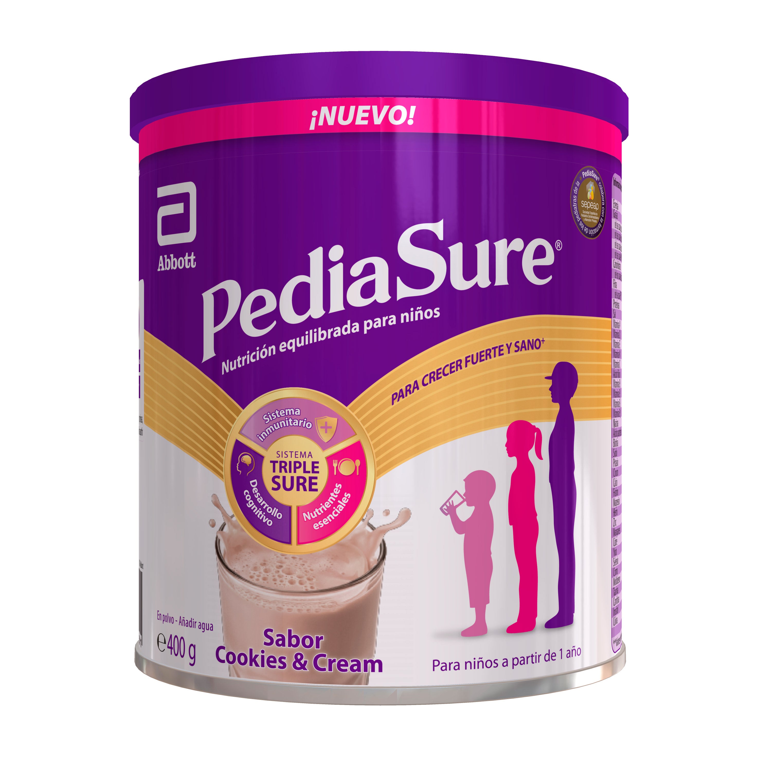 PediaSure® Sabor cookie & cream é a única fórmula de alimentação especializada com os 5 grupos de nutrientes essenciais, clinicamente comprovada, que apoia a nutrição de crianças de até 13 anos. Para uso em menores de 1 ano, consulte seu médico, com deficiências que impactam no seu crescimento.