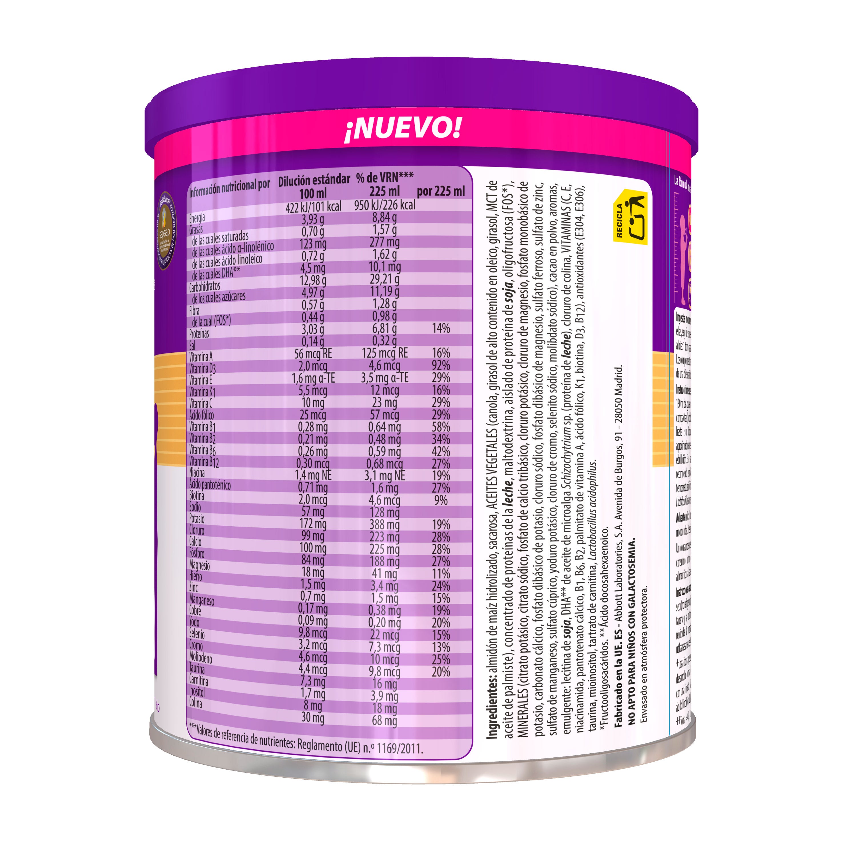 Almidón de maíz hidrolizado, sacarosa, ACEITES VEGETALES (canola, girasol de alto contenido en oleico, girasol, MCT de aceite de palmiste), concentrado de proteínas de la leche, maltodextrina, aislado de proteína de soja, oligofructosa (FOS*), MINERALES (citrato potásico, citrato sódico, fosfato de calcio tribásico, cloruro potásico, cloruro de magnesio, fosfato monobásico de potasio, carbonato cálcico, fosfato dibásico de potasio, cloruro sódico, fosfato dibásico de magnesio, sulfato ferroso, sulfato de zinc, sulfato de manganeso, sulfato cúprico, yoduro potásico, cloruro de cromo, selenito sódico, molibdato sódico), cacao en polvo, aromas, emulgente: lecitina de soja, DHA** de aceite de microalga Schizochytrium sp. (proteína de leche), cloruro de colina, VITAMINAS (C, E, niacinamida, pantotenato cálcico, B1, B6, B2, palmitato de vitamina A, ácido fólico, K1, biotina, D3, B12), antioxidantes (E304, E306), taurina, mioinositol, tartrato de carnitina, Lactobacillus acidophilus. Fructooligosacáridos. *Ácido docosahexaenoico.