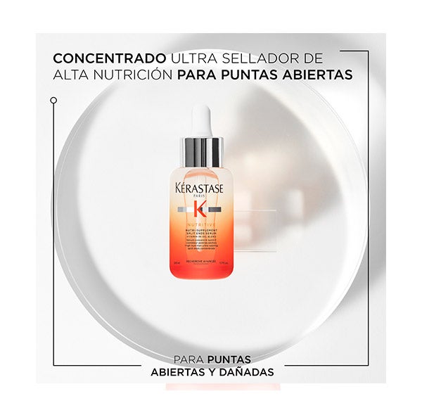 Nutri-Supplement Split-Ends Serum de Kérastase é um sérum ultra selante de alta nutrição para cabelo seco com pontas duplas. Este tratamento para pontas duplas contém polímeros anti-secagem para selar as pontas secas, prevenindo o aparecimento de pontas duplas. Também oferece uma dose de nutrientes essenciais que aumentam a capacidade da fórmula para nutrir e fortalecer o cabelo.