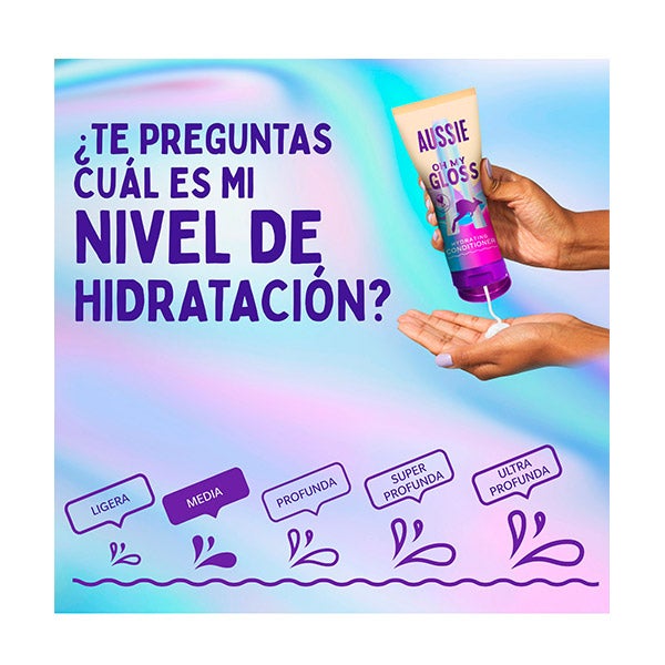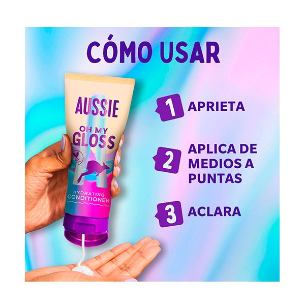 2 FORMAS AUSSIE DE USAR: 1. Após lavar com o shampoo Aussie Oh My Gloss, aplique uma boa quantidade de condicionador no comprimento e enxágue. 2. Em dias sem lavagem, aplique no cabelo e deixe agir para um toque extra fabuloso
