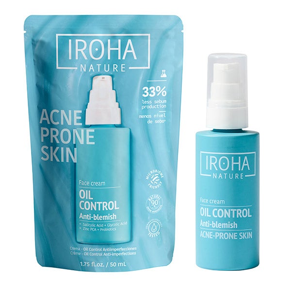 Crema Oil Control Antiimperfecciones de Iroha Nature ayuda a acabar con la sequedad, irritación y descamación, hidratando de forma intensa y duradera las pieles con tendencia acneica, sin obstruir los poros. Su fórmula efectica y altamente concentrada, con ingredientes no comedogénicos, ayuda a equilibrar la producción de sebo mientras calma y refuerza la barrera cutánea. Dermatológicamente probada y con resultados probados, esta crema con consistencia ligera a base de Niacinamida 5%, ácido salicílico, zinc PCA y probióticos reduce el exceso de brillo y grasa y promueve una piel más hidratada y saludable.