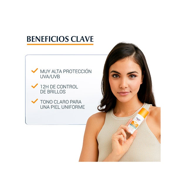 Fotoprotetor com cor clara FPS 50+ formulado para as necessidades específicas da pele oleosa e propensa à acne que proporciona um efeito anti-brilho durante 12 horas.