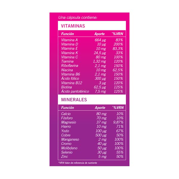 K), Ácido fólico, Cianocobalamina (Vitamina B12), Picolinato de cromo (Cromo), Yoduro potásico (Yodo), Molibdato