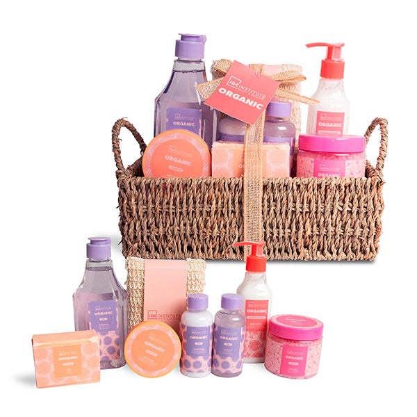 Esta cesta reutilizável com produtos naturais de óleos essenciais é o presente perfeito para aqueles que gostam de se cuidar, pois inclui um gel de banho, sais de banho, uma loção corporal, um sabonete sólido, shampoo, condicionador, creme para as mãos, esfoliante corporal, escova corporal e uma esponja de sisal.