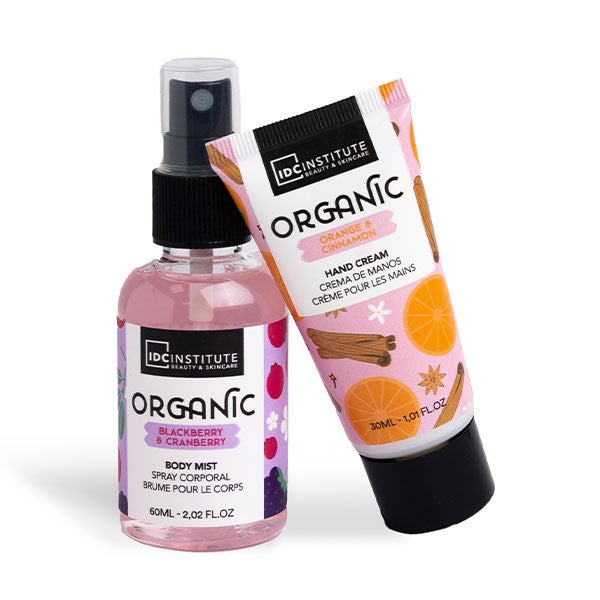 Inclui um creme para as mãos e uma colônia corporal com aromas naturais de laranja, canela, amora e mirtilo.