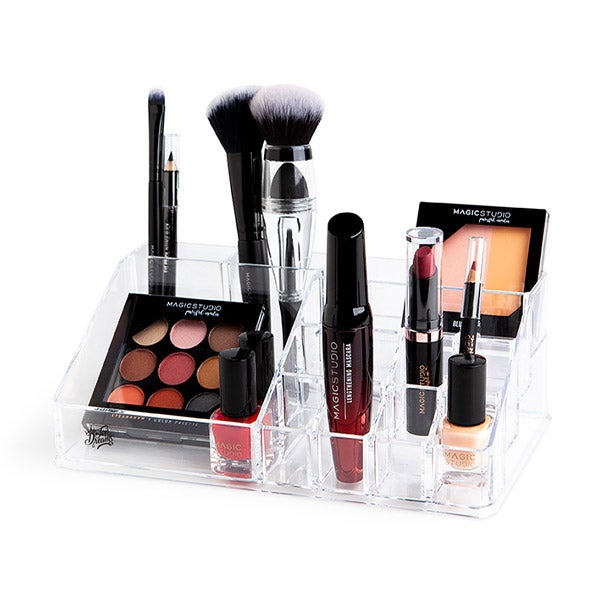 Mantenha sua maquiagem e acessórios bem organizados com este organizador de metacrilato transparente que inclui: seis compartimentos para batons, dois copos para pincéis e um espaço multiuso para esponjas, esmaltes, elásticos de cabelo...