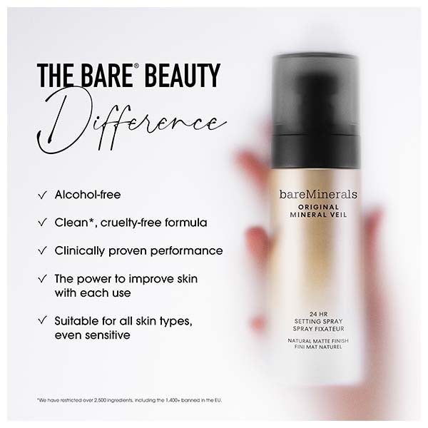 bareMinerals Original Mineral Veil 24HR Matte Setting Spray prolonga a duração da maquiagem e é resistente ao suor, à água e às transferências. Esta fórmula sem álcool, elaborada com 95% de ingredientes para o cuidado da pele, também hidrata, matifica e suaviza a pele mantendo a sensação de conforto e leveza por 24 horas.