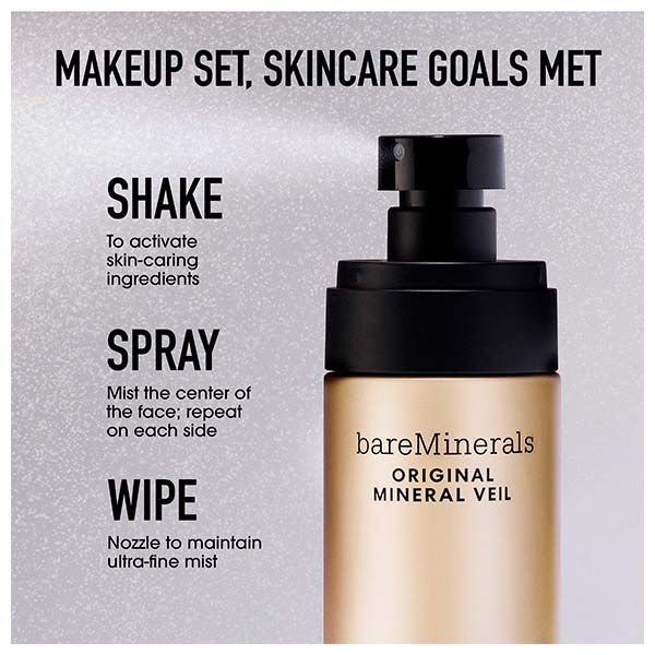Forma ampliada: Use-o sozinho para obter benefícios que melhoram a pele ou sobre o seu produto favorito da bareMinerals para fixar e proteger sua maquiagem por até 24 horas em apenas 3 pulverizações.