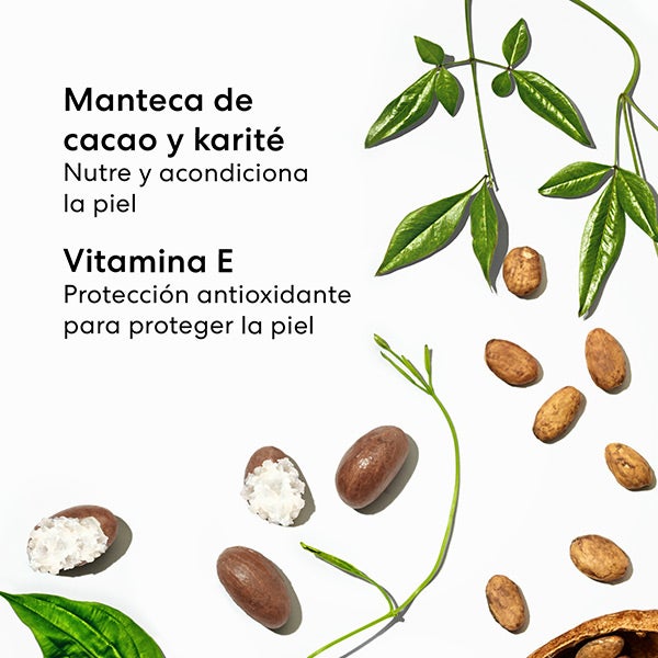 Fórmula enriquecida com manteiga de karité, manteiga de cacau e vitamina E para proteger a pele das agressões ambientais.