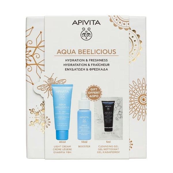 O estojo Aqua Beelicious da Apivita inclui três produtos projetados para o cuidado facial. Contém um creme-gel hidratante oil free Aqua Beelicious, que proporciona hidratação e frescor, reequilibrando a oleosidade da pele e oferecendo um acabamento mate. Inclui um booster hidratante e refrescante em formato especial, que reforça e alisa a pele. Inclui um gel de limpeza Black Detox, que contém carvão ativo e própolis, limpando eficazmente o rosto e os olhos sem ressecar a pele. Destinado a mulheres que buscam combater as primeiras rugas.