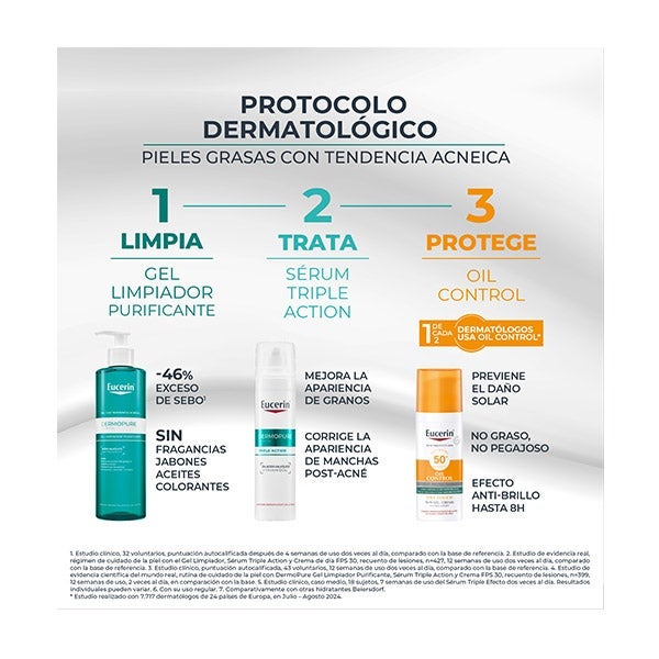 um gel de limpeza purificante que controla o sebo e desobstrui os poros, um sérum de tripla correção que atua sobre espinhas, cravos e manchas pós-acne, e um protetor solar facial Oil Control que protege a pele contra os danos solares e previne o agravamento das imperfeições.