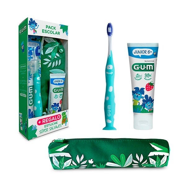 Inclui uma escova e uma pasta de dentes GUM JUNIOR ideal para crianças de 6 anos ou mais, além de um prático estojo para transportar tudo.